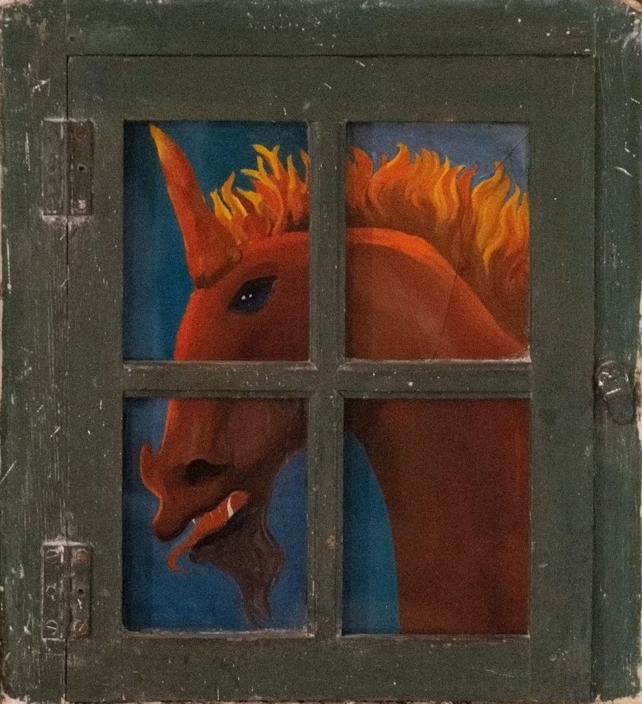 Cette licorne sur la fenêtre de la cuisine, c’est un peu un autoportrait pour Leonora, jeune femme libre et indépendante, excellente cavalière, qui s’est toujours associée au cheval. La licorne, c’est l’animal-fée du Moyen-Âge, tout comme Leonora incarne la femme-fée envoûtante chère aux surréalistes. Fascinée par l’alchimie, la cuisine est son domaine. Mélangeant les saveurs, en créant de nouvelles, pour le plaisir des sens, elle est la gardienne du foyer et veille à la convivialité du lieu. Son amie Lee Miller, quand elle abandonnera la photographie, suite aux traumatismes de la guerre, se tournera aussi vers la cuisine.